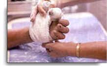Equally critical to Dr. Brand's treatment approach is understanding and addressing the psychological ramifications of neuropathy that make treatment protocol sometimes difficult to follow. Neuropathy, specifically peripheral neuropathy, alters or eliminates a persons body perception, proprioception or touch/pain reception. The limbs no long er respond normally. This is significant because the perception of pain is the leading indicator of body malfunction, a consequence of bodily harm, without which a person can cause damage or continued damage to self with no awareness of injury. The client with a plantar ulcer typically will not walk into the clinic limping or complaining of pain. To compensate for this insensitivity to pain the patient, family members and health professionals have to make an extra effort to manage existing wounds. Visually inspecting and touching the feet daily for any evidence of new trauma or injury are essential habits to develop in an effort to protect the feet from injury. "Pain: The Gift Nobody Wants" is the title of one of Dr. Brand's books and a phrase used to initiate the explanation regarding the devastating consequences that can occur from limbs without the necessary warning system of pain.