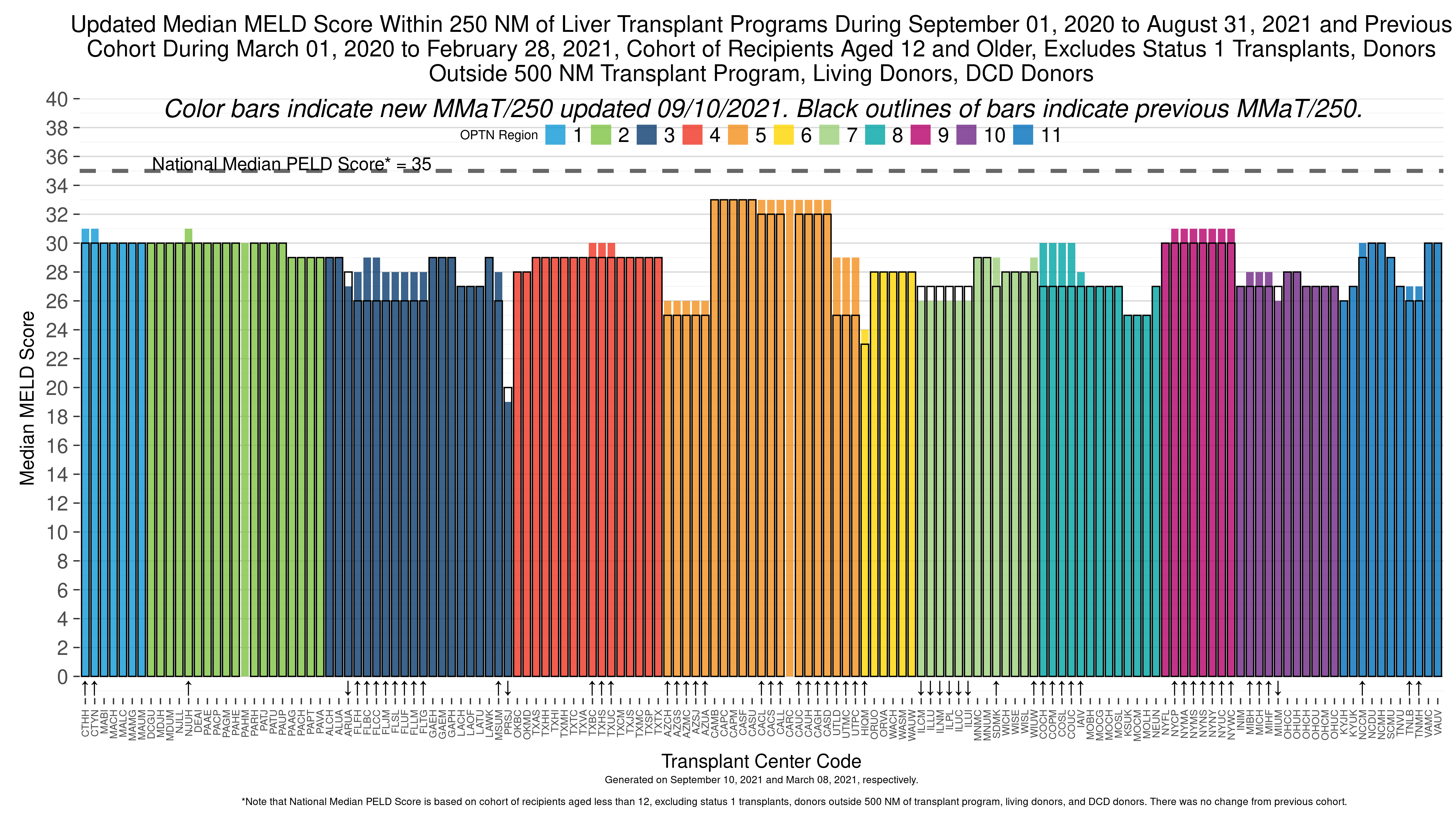 - Median MELD at Transplant by 250 Nautical Mile Circles Around Liver Transplant Programs and Median PELD at Transplant Within the Nation (PDF - 447 KB) (10/2021)