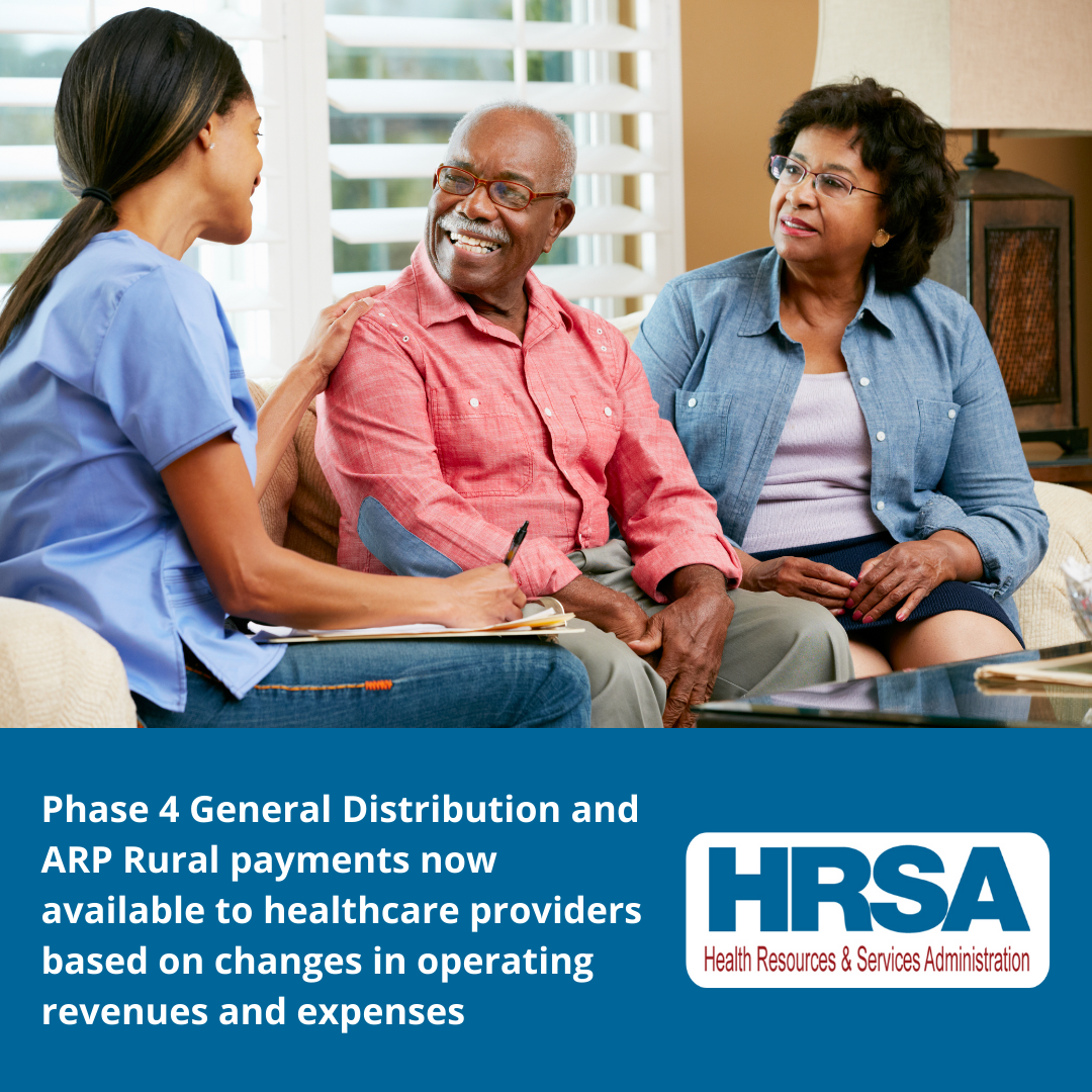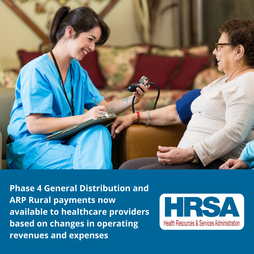| Download Image | Home Health Services Providers | ATTENTION home health providers—you may be eligible for financial relief. Learn more and apply now for #ProviderReliefFund Phase 4 and #AmericanRescuePlan Rural payments at: http://hrsa.gov/provider-relief/future-payments |
